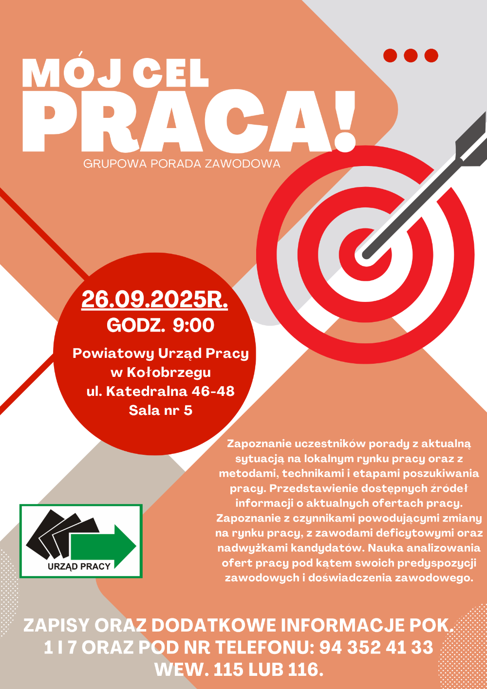 W dniu 26.09.2025r. o godz. 9:00 w sali nr 5 Powiatowego Urzędu Pracy w Kołobrzegu odbędzie się spotkanie pt.: „Mój cel- Praca.”